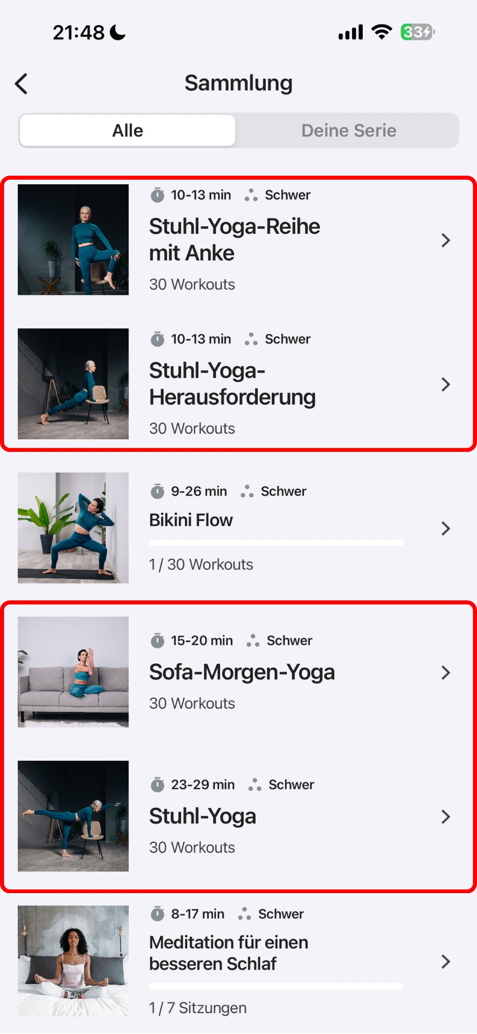 Du kannst auch einige der anderen Workouts ausprobieren, die unter Aktuell beliebt / Top-Serien für dich aufgeführt sind, wie z. B. Yoga zum Abnehmen, Flacher Bauch & Starker Core, Somatisches Yoga, Stuhl-Yoga-Reise mit Anke und Wand-Pilates zum Abnehmen. Alle diese Workout-Serien eignen sich für Anfänger und Senioren und können zur Sammlung Deine Serien hinzugefügt werden, damit du sie jederzeit leicht wiederfindest, wenn du sie absolvieren möchtest. Dafür tippe einfach auf das Trainingsset und dann auf die Schaltfläche Beitreten+.