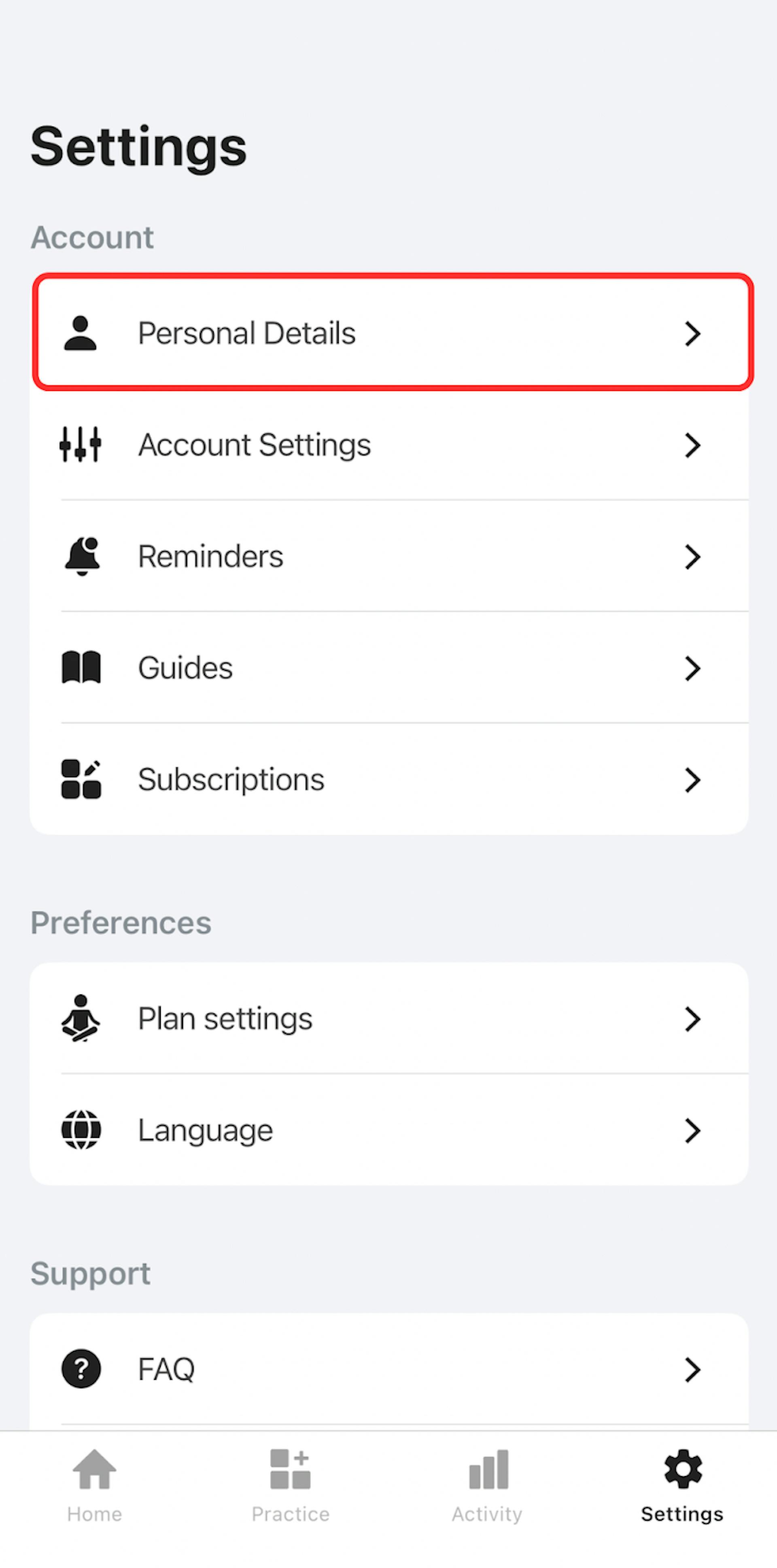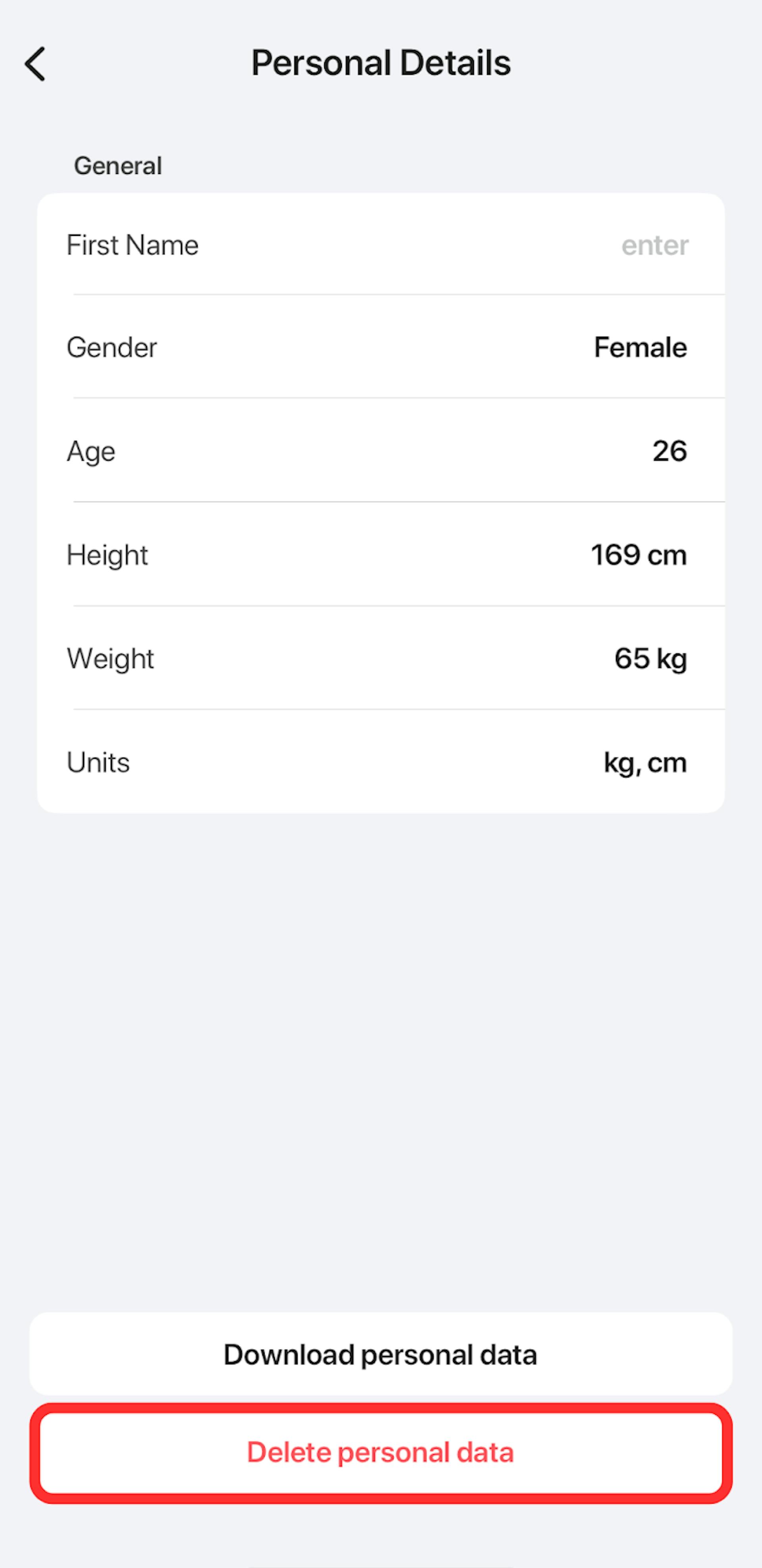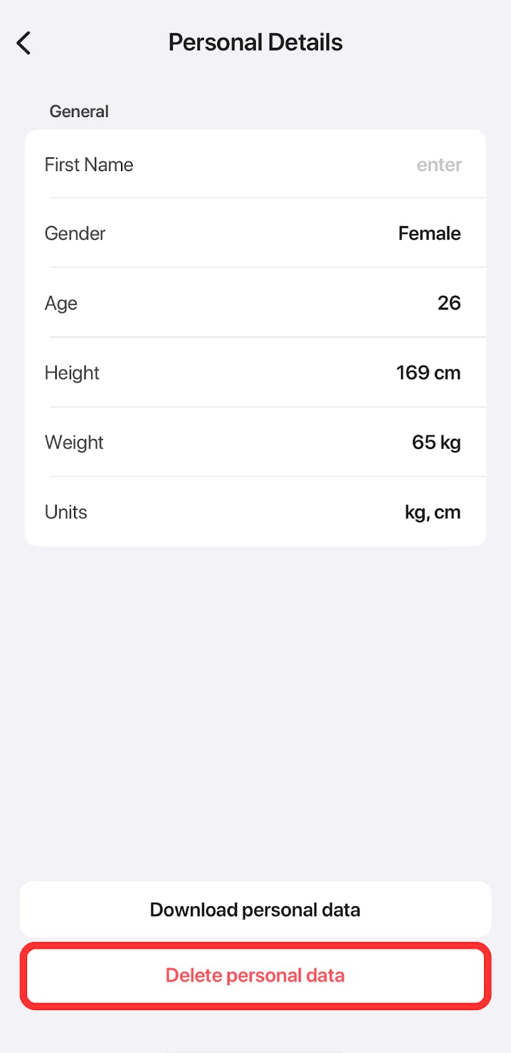 In order to delete your personal data, go to the Settings tab in the Yoga-Go app, and tap Personal Details.
