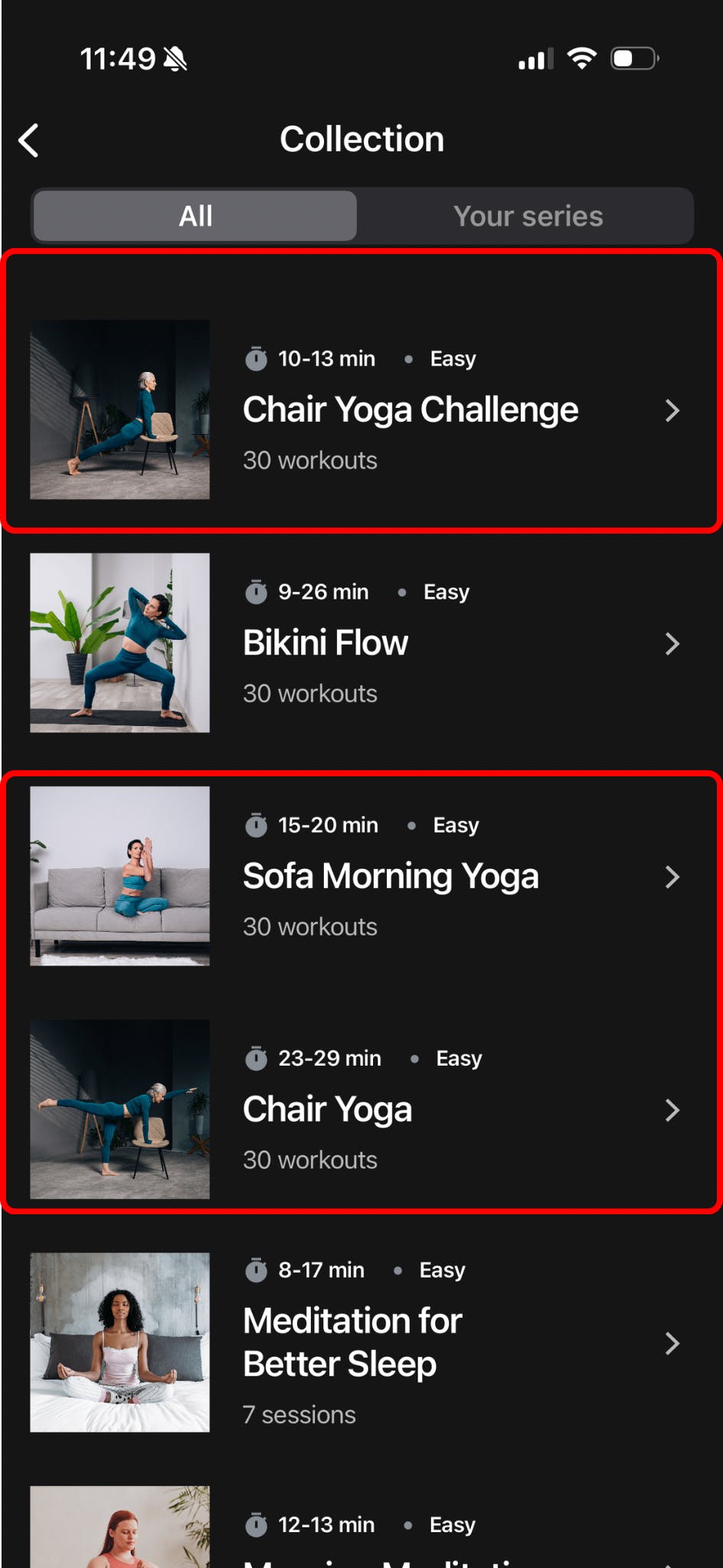 You may also want to try some of the other workouts listed under Popular Now / Top Series for You, such as Yoga for Weight Loss, Flat Belly & Strong Core, Somatic Yoga, Chair Yoga Journey with Anke, and Wall Pilates for Weight Loss. All of these workout series are suitable for beginners and seniors, and can be added to the Your Series collection so they can be easily found whenever you want to practice them. To do this, simply tap on the training set and tap the Join+ button.