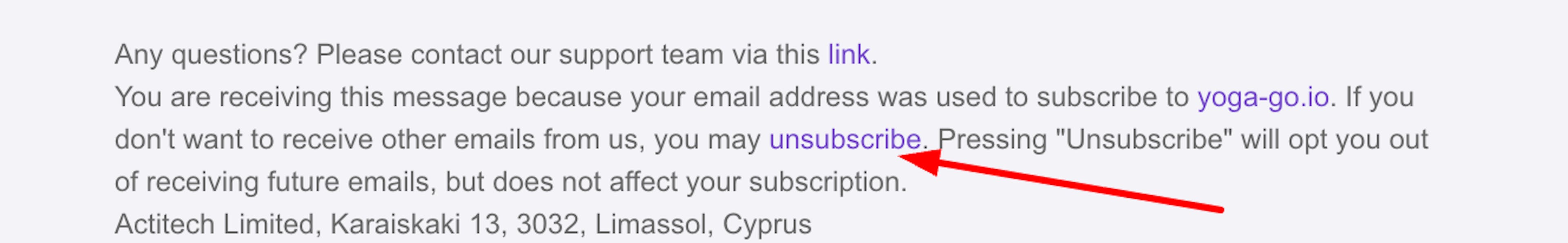 If you no longer want to receive emails from us, you can unsubscribe from our mailing list via the Unsubscribe hyperlink at the bottom of our emails, as shown below.