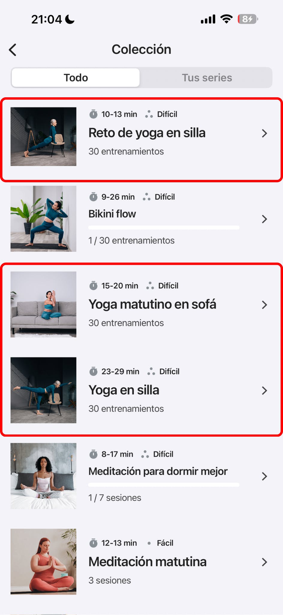 También puedes probar otros entrenamientos que se encuentran en la sección Popular ahora / Series principales para ti, como Yoga para perder peso, Vientre plano y core fuerte, Yoga somático, Viaje de Silla Yoga con Anke y Pilates en la pared para perder peso. Todas estas series de entrenamientos son adecuadas para principiantes y personas mayores, y pueden añadirse a la colección Tus series para que puedas encontrarlas fácilmente siempre que desees practicarlas. Para hacerlo, simplemente pulsa en el conjunto de entrenamientos y selecciona el botón Unirse+.