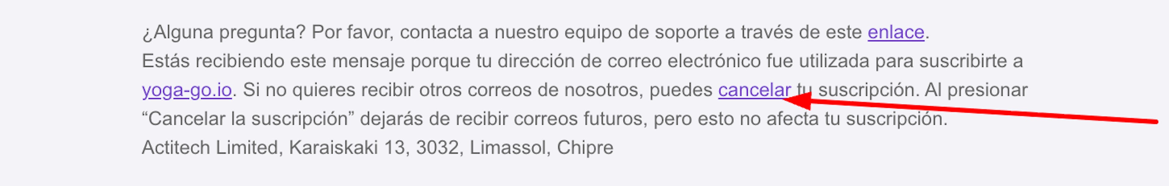 Si ya no deseas recibir correos electrónicos nuestros, puedes darte de baja de nuestra lista de distribución mediante el hipervínculo Cancelar que encontrarás al final de nuestros correos electrónicos, tal y como se muestra a continuación.