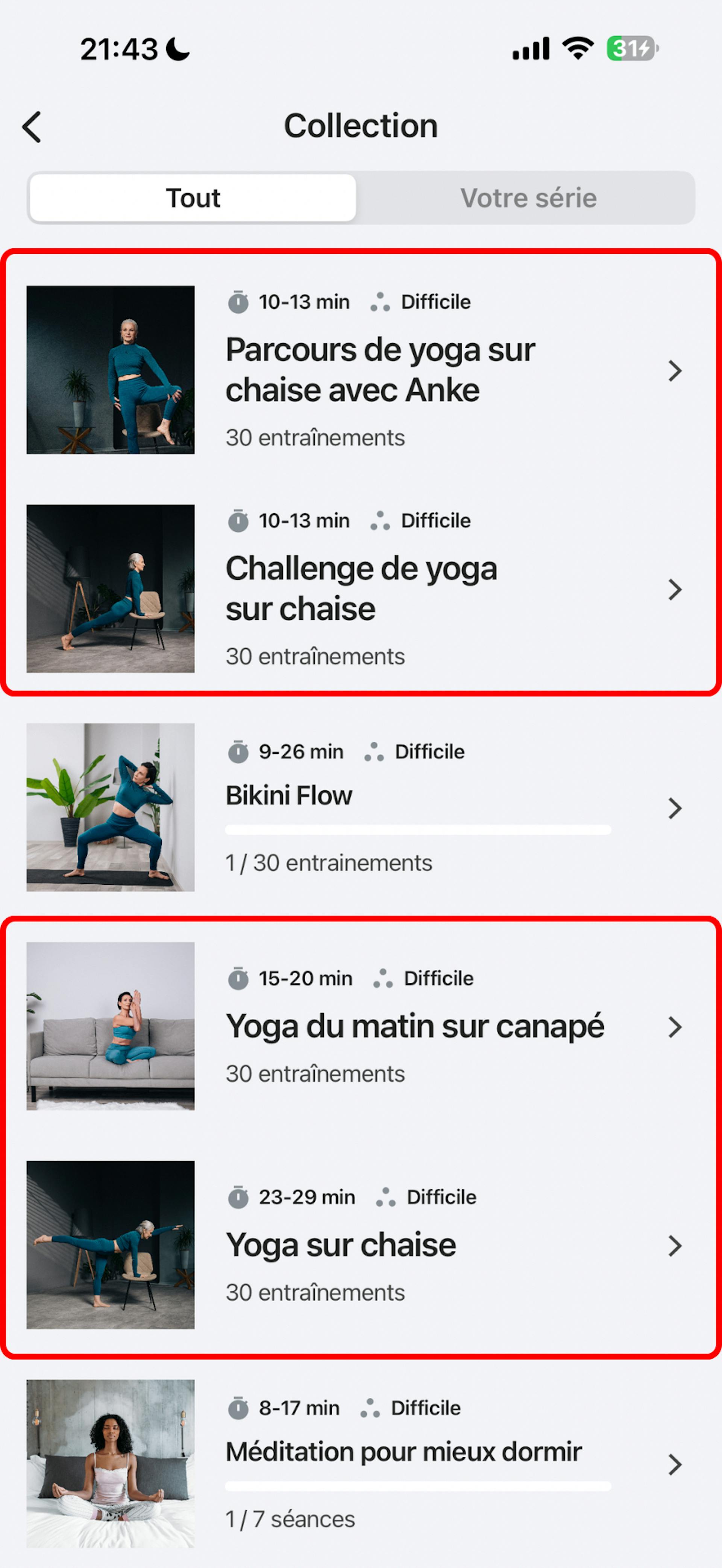 Vous pouvez également essayer d’autres entraînements listés dans Populaires en ce moment / Séries recommandées pour vous, tels que Yoga pour la perte de poids, Ventre plat & abdos forts, Somatic Yoga, Chair Yoga Journey with Anke, et Wall Pilates pour la perte de poids. Toutes ces séries d’exercices conviennent aux débutants et aux seniors, et peuvent être ajoutées à la collection Vos séries afin qu’elles soient facilement accessibles chaque fois que vous souhaitez les pratiquer. Pour ce faire, il suffit d’appuyer sur la série d’entraînement choisie puis sur le bouton Rejoindre+.