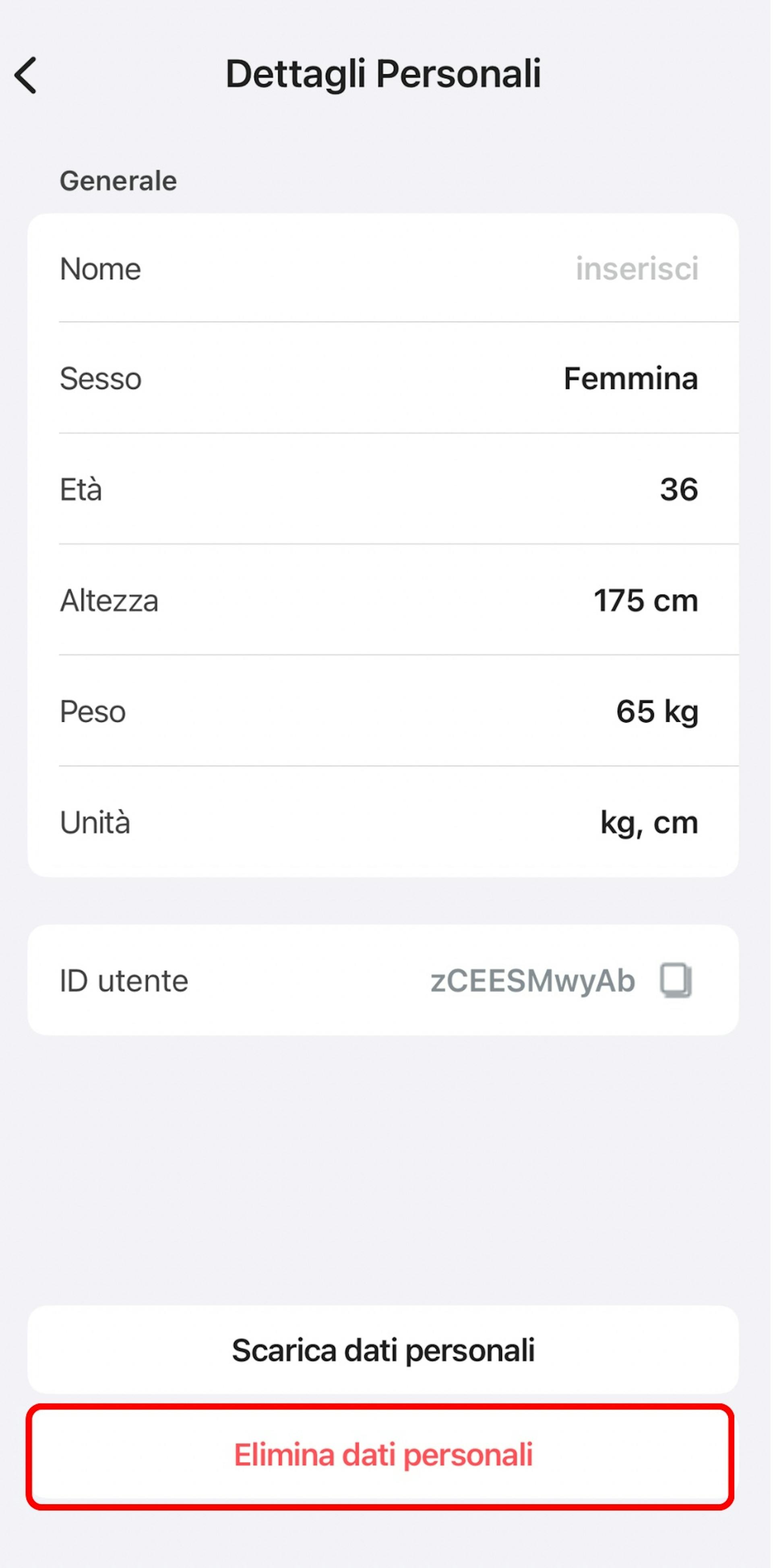 Tocca il pulsante Elimina dati personali.