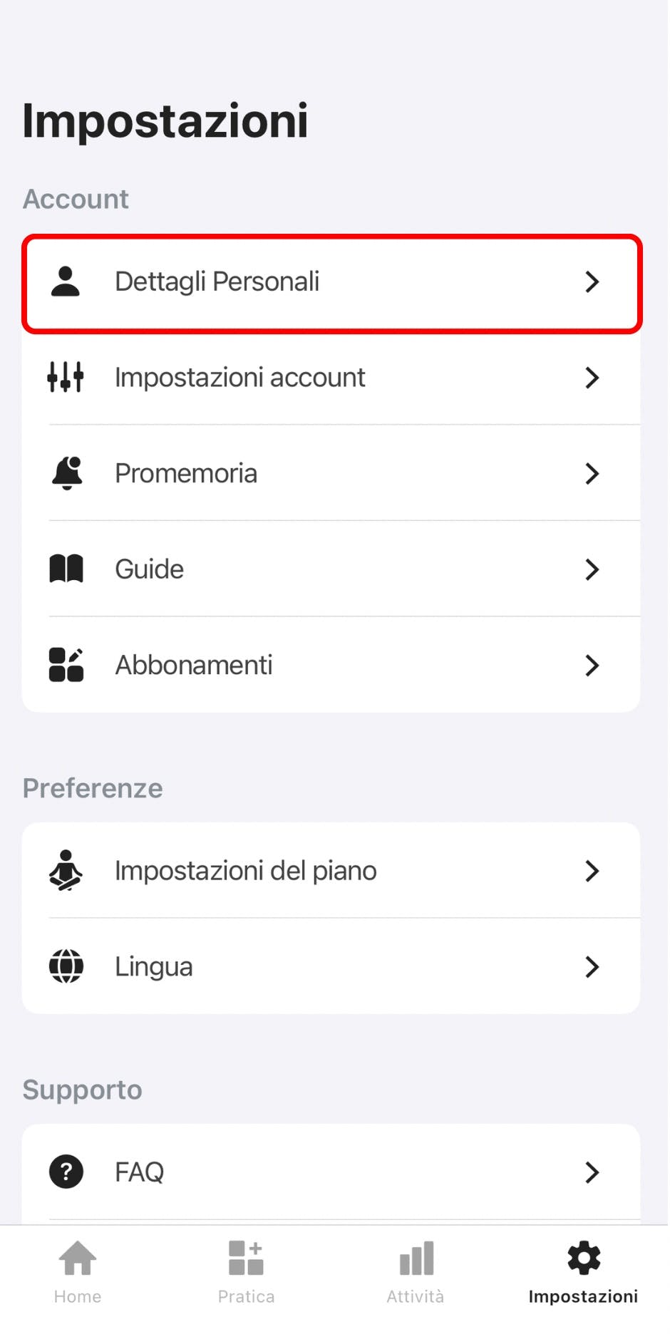 Per eliminare i tuoi dati personali, vai nella scheda Impostazioni nell'app Yoga-Go e tocca Dettagli personali.