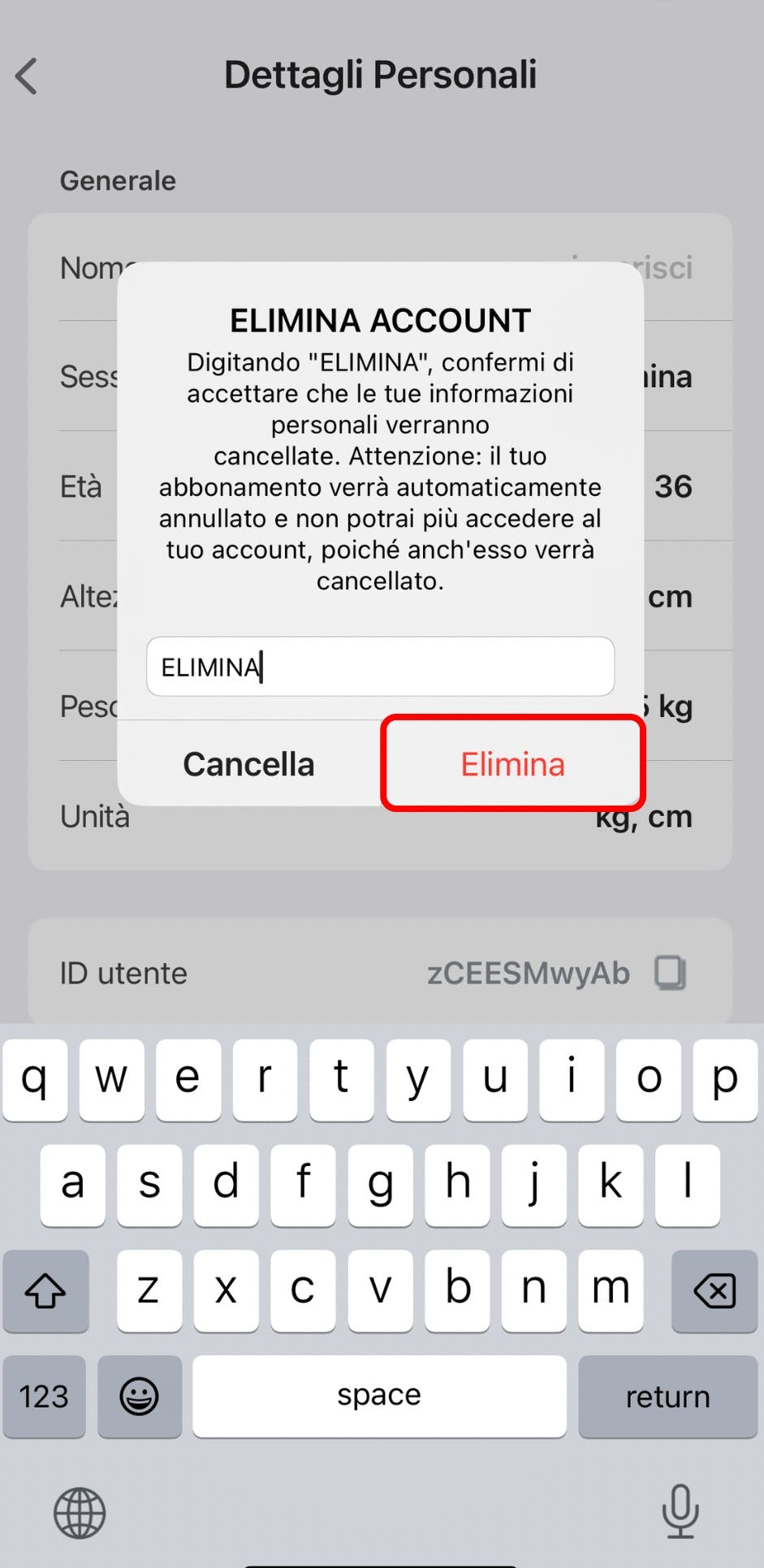 Conferma l’eliminazione digitando ELIMINA nel campo per procedere.