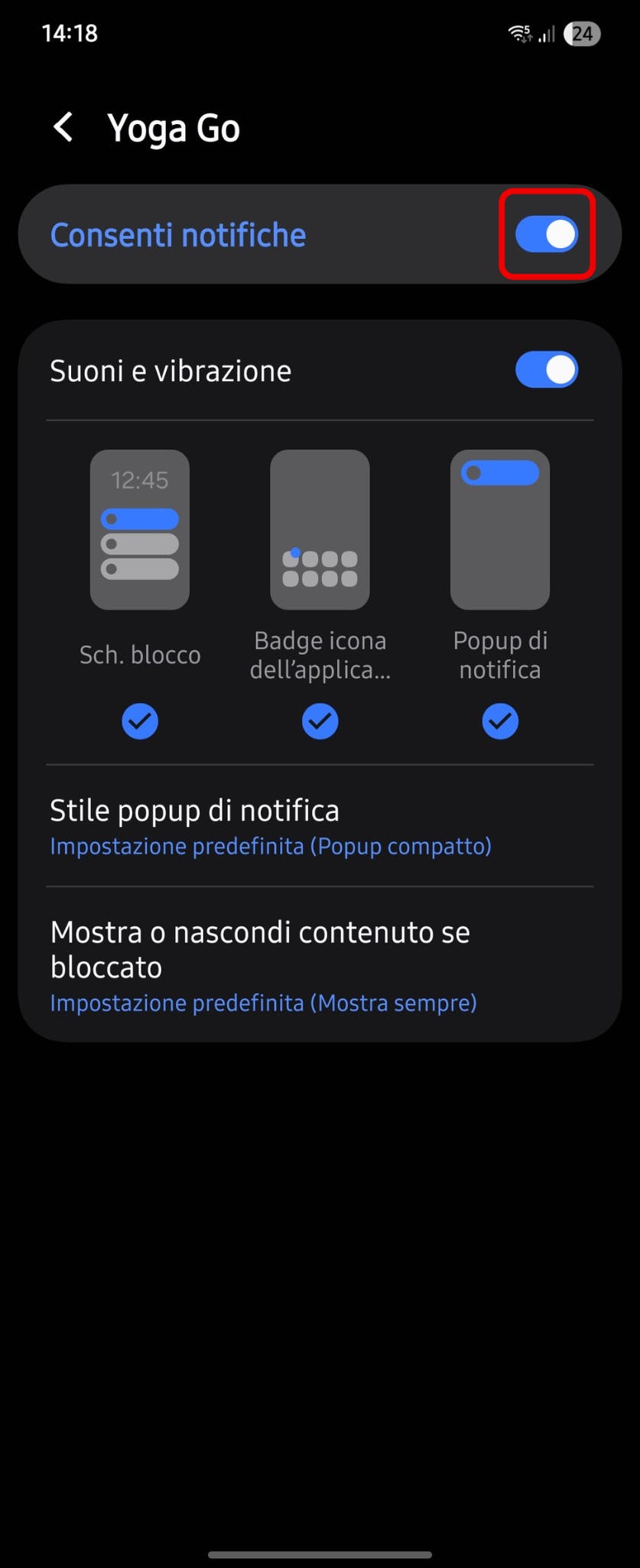 Come posso attivare o disattivare le notifiche di Yoga-Go?