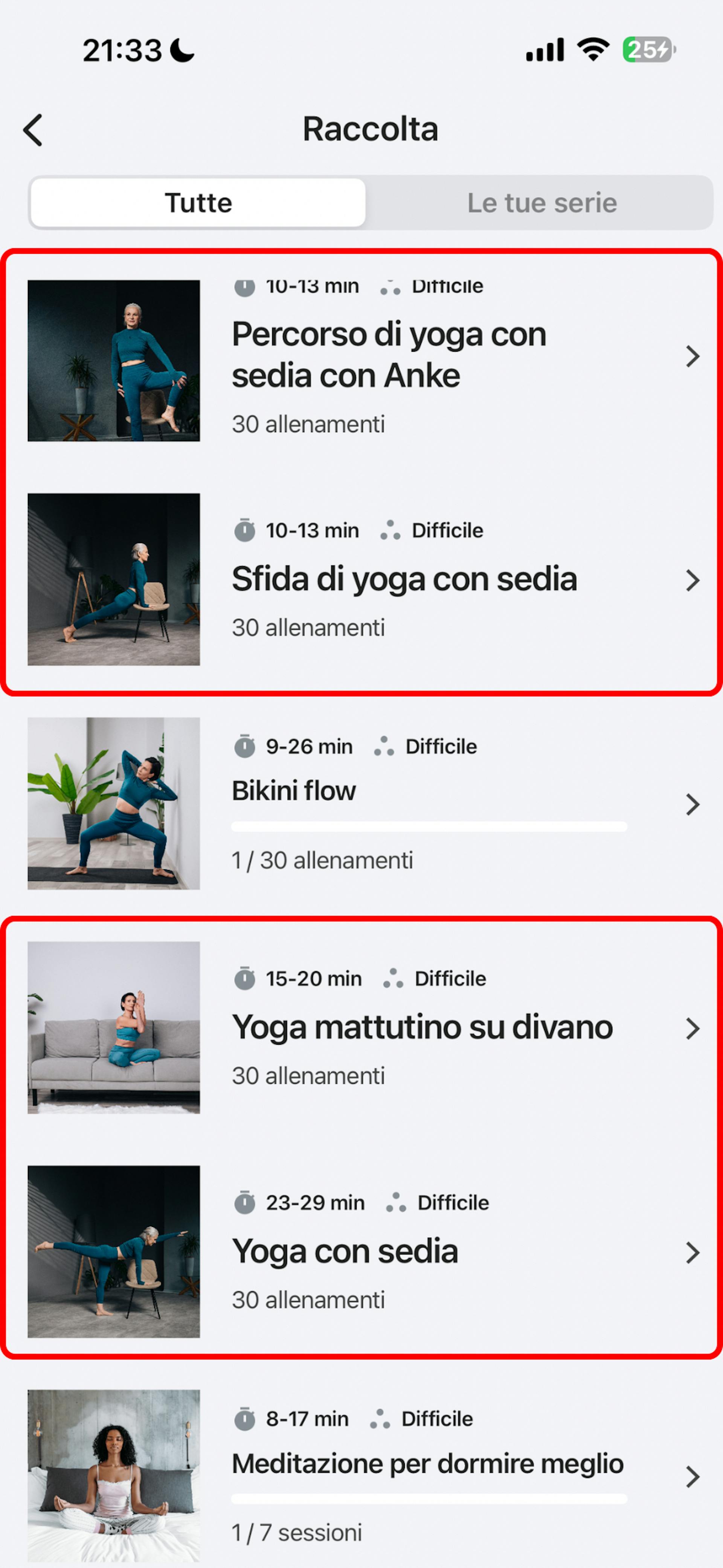 Nell'app Yoga-Go sono presenti gli allenamenti Divano Yoga e Sedia Yoga, progettati principalmente per persone anziane e principianti di yoga. Per trovarli nell'app, segui le istruzioni riportate di seguito.