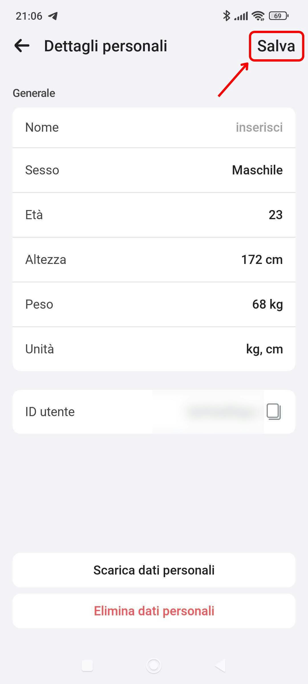 Per aggiornare la tua altezza, peso o unità di misura, segui questi passaggi: