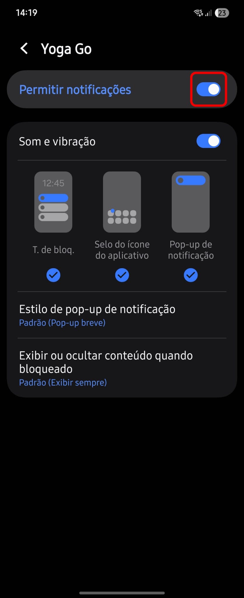 Como posso ativar ou desativar notificações do Yoga-Go?