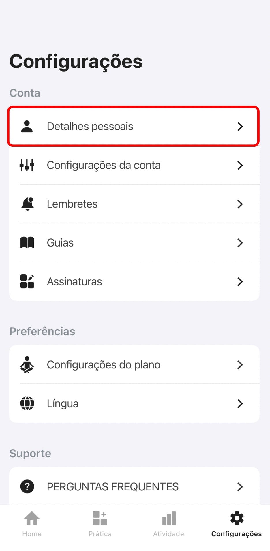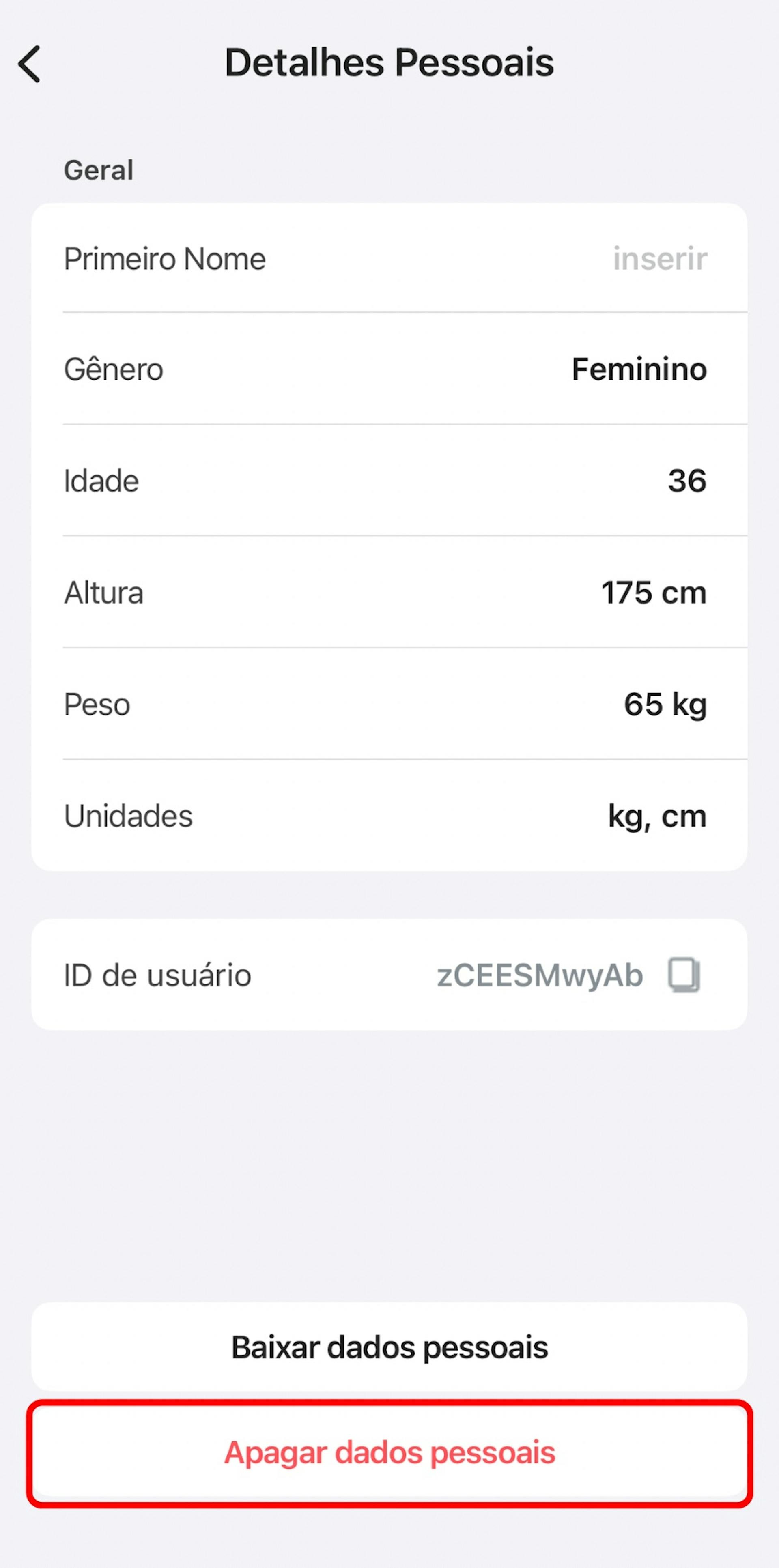Para excluir seus dados pessoais, acesse a aba Configurações no aplicativo Yoga-Go e toque em Detalhes Pessoais.
